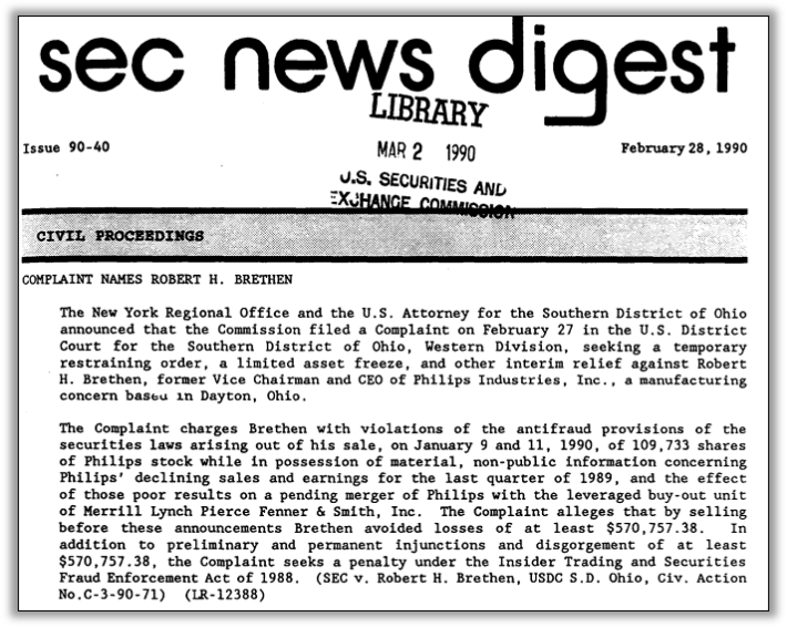 An Internet search led to this notice of the complaint against Brethen in the March 1990 SEC Digest and at least two articles in the New York Times. The Times stated his attorneys advised him against the trade, but he ignored their advice.