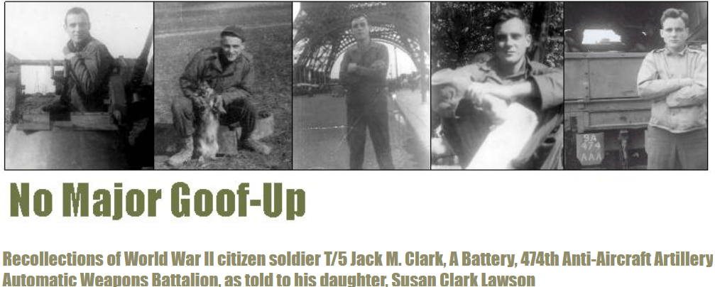 Around 2014(?), a year or so after converting my dad’s World War II story into a website, I received an email from a man in Belgium looking for information for a book he was researching. His search for information on the 474th AA-AW, my dad’s unit, eventually hit on that website, “No Major Goofup.” AA-AW stands for antiaircraft artillery-automatic weapons, and dad’s battalion commandeered half-tracks (tires upfront, tank treads in back) mounted with a minesweeper, 50-caliber machine guns and a 37-caliber canon.